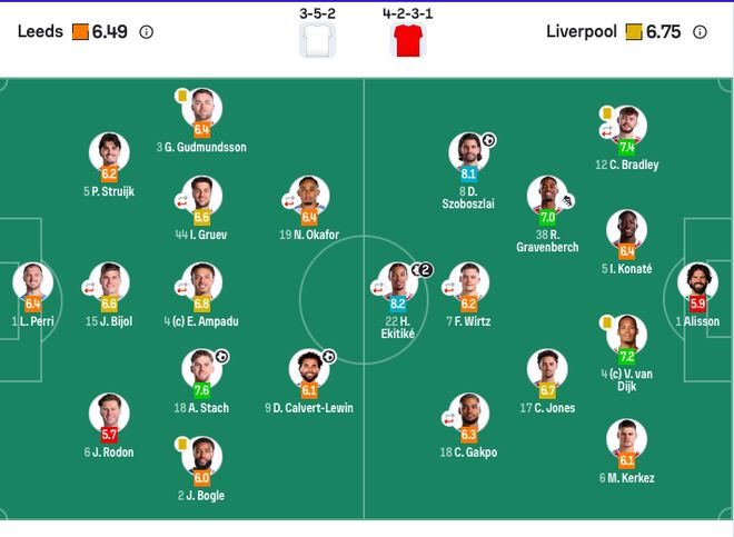 【出场阵容】利物浦首发:1-阿利松、4-范戴克、5-科纳特、6-凯尔凯兹、12-布拉德利(68’12-戈麦斯)、17-琼斯、38-赫拉芬贝赫、8-索博斯洛伊、18-加克波(83’9-伊萨克)、7-维尔茨(68’10-麦卡利斯特)、22-埃基蒂克(83’3-远藤航)。利物浦替补:25-马马尔达什维利、11-萨拉赫、14-基耶萨、26-罗伯逊、73-恩古莫哈。利兹联首发:1-佩利、2-杰登·博格、3-古德蒙德森、6-罗登、15-比约尔(61’29-尼翁托)、5-斯特鲁伊克、4-阿姆帕杜(87’10-皮罗)、44-古尔夫(61’22-田中碧)、18-斯塔赫、19-奥卡福(61’11-阿隆森)、9-勒温。利兹联替补:26-达尔洛、23-博瑙、25-拜拉姆、20-哈里森、24-贾斯汀。
